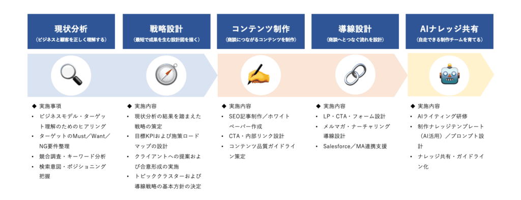 戦略設計からSEO・ホワイトペーパー制作、AI研修まで一気通貫で支援します。