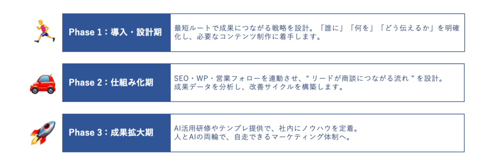 私たちは、“ 商談につながるコンテンツマーケティングの仕組み ”を3つのフェーズで構築します。