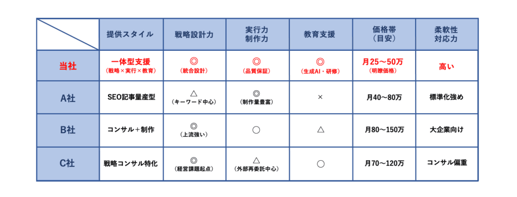 生成AI時代当社が目指すのは、コンサルの論理性 × 制作会社の実行力 × 教育会社の再現性。“成果を再現できる仕組み”を設計・実装できる、コンテンツマーケティング支援パートナーです。AI研修まで一気通貫で支援します。