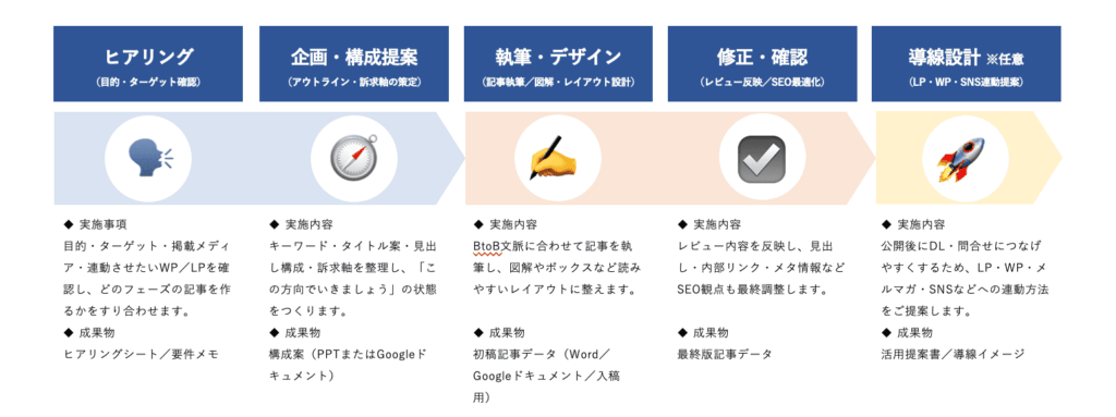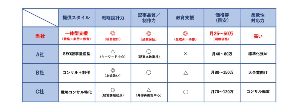 戦略設計から記事制作・AI活用・改善提案までを一気通貫で支援します。