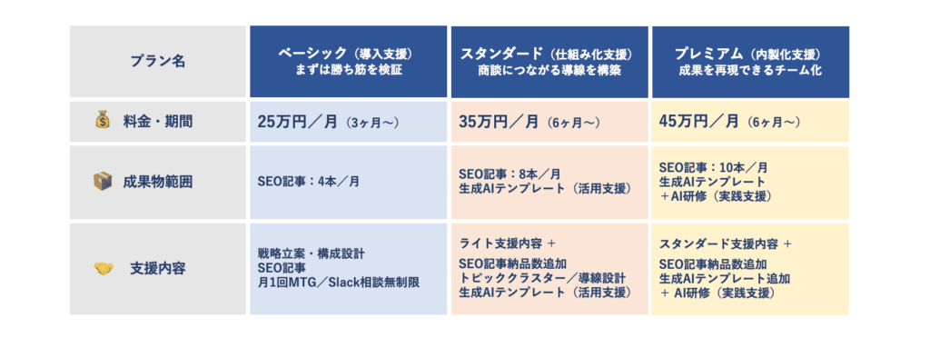 SEOを“リード創出の仕組み”として運用できるように、目的別の支援プランを設計しています。