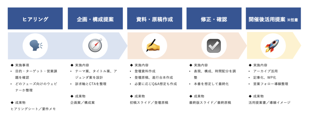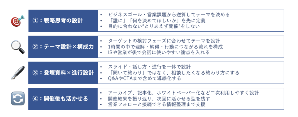 商談につながるウェビナーを、実行しやすい流れで形にします。